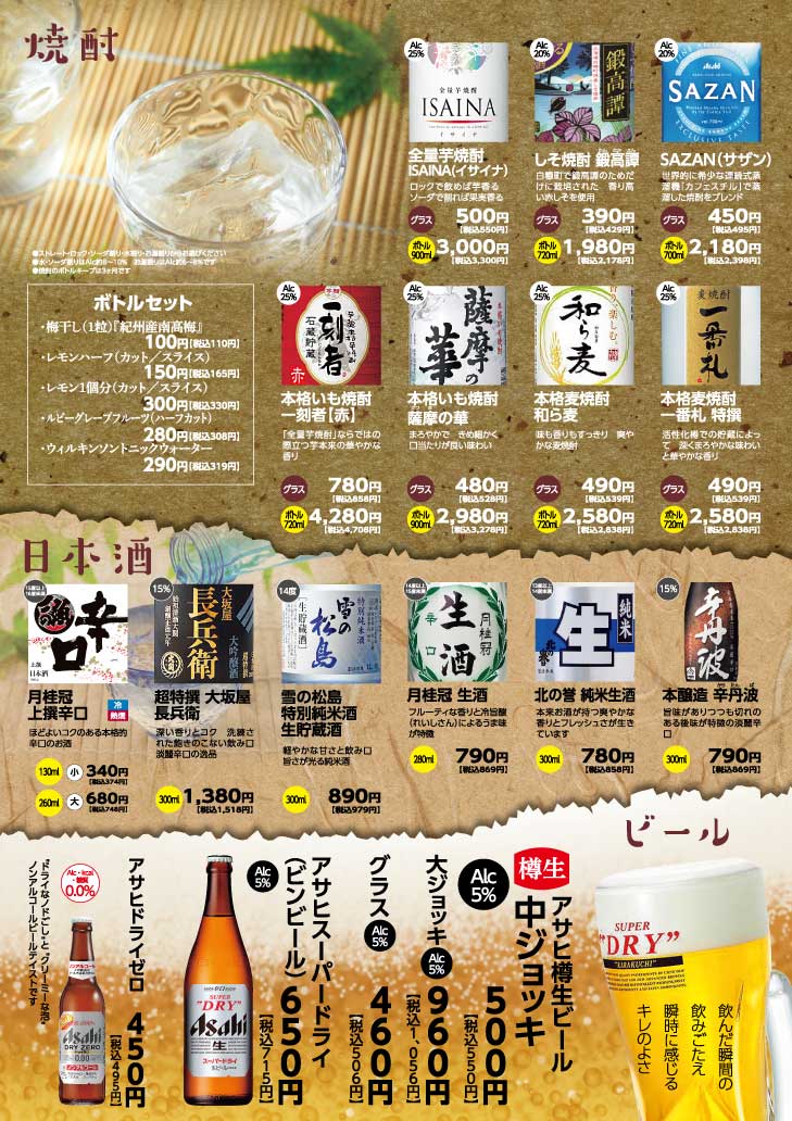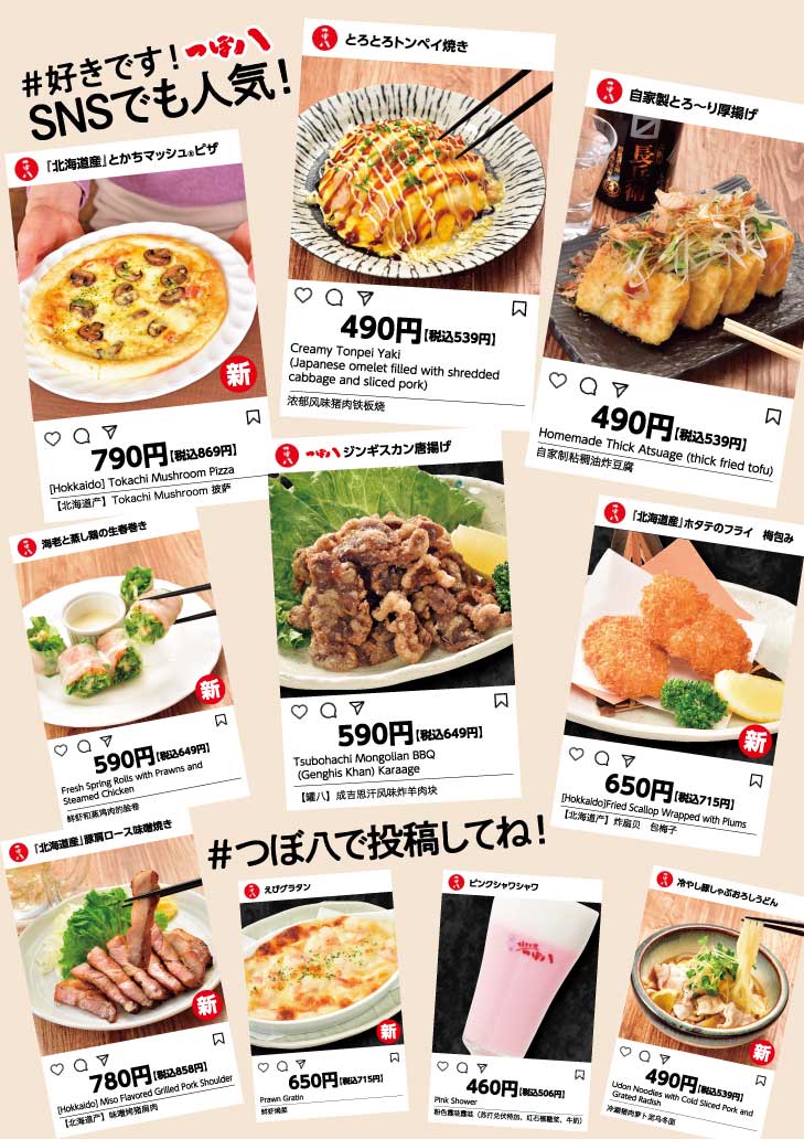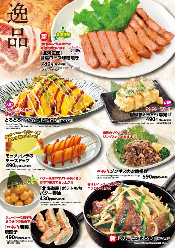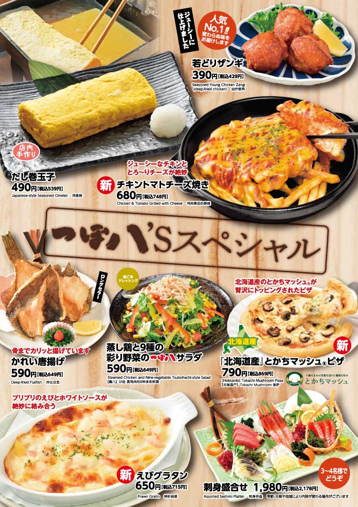 What truly elevates the menu, however, is the つぼ八’s スペシャルメニュー , which brings together variety and visual appeal. The 若どりザンギ, a Hokkaido-style fried chicken, represents comfort food at its best with its crispy exterior and tender interior, making it an easy favorite for both first-time visitors and regulars. Complementing this richness is the 蒸し鶏と9種の彩り野菜のつぼ八サラダ, a thoughtfully composed salad that balances steamed chicken with nine types of colorful vegetables, adding freshness and nutritional contrast to the menu.